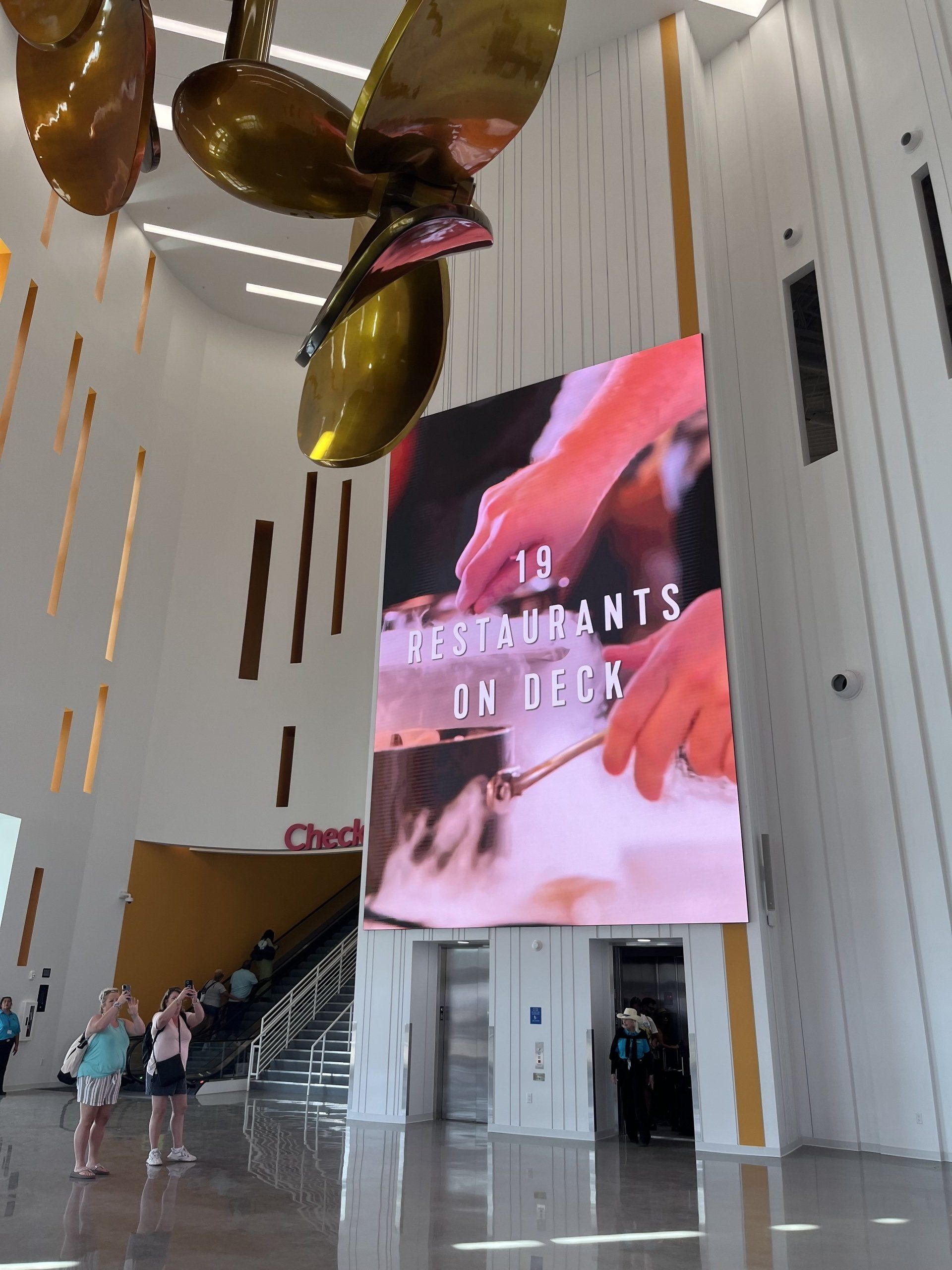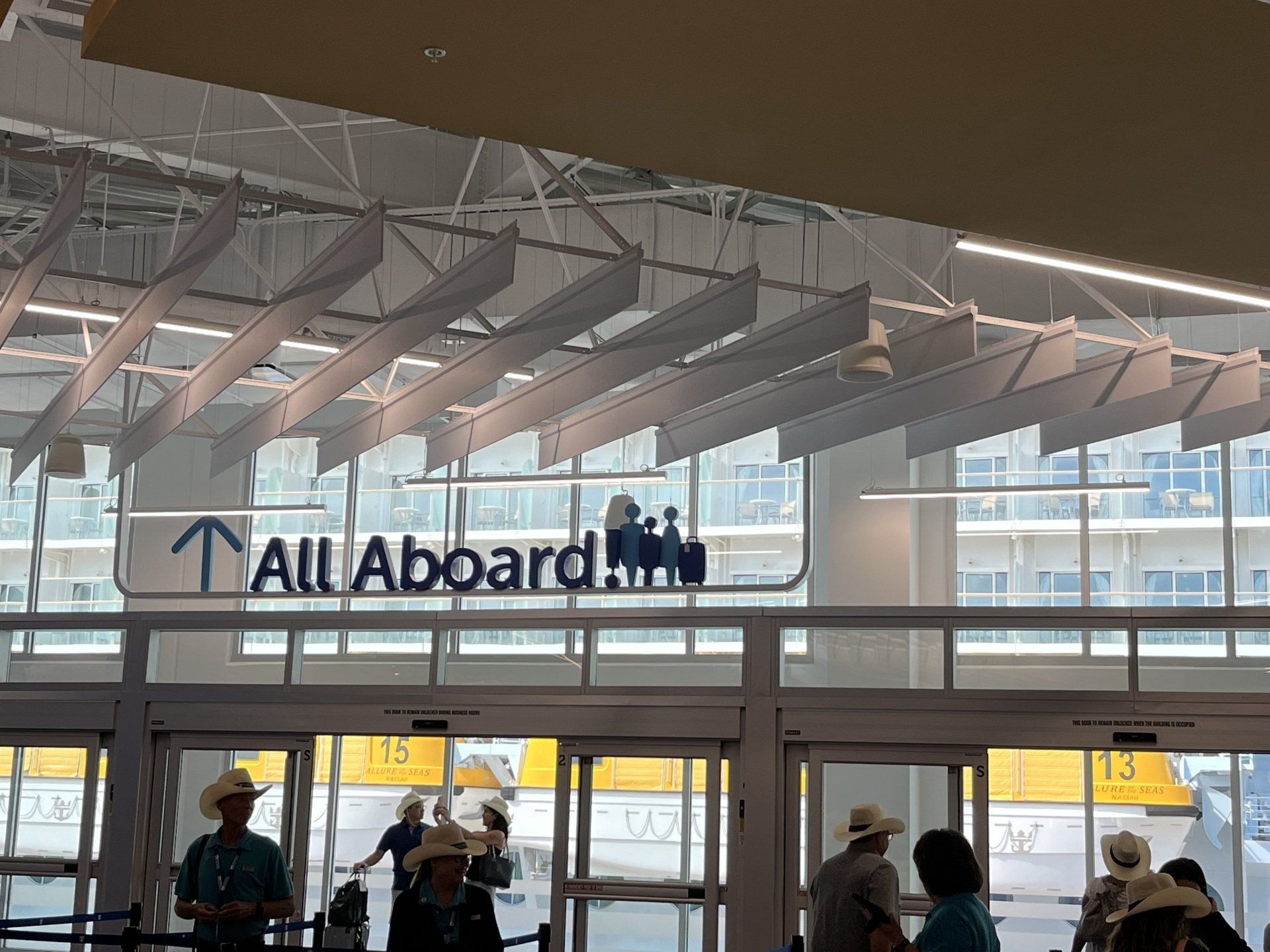 The new terminal is located off 14th street and has a North lot (next to the ship), a South lot, and the 14th Street parking (on a pier). Shuttle buses run to the drop off along the ship. You have the option of checking your bags and waiting for them to be delivered to your room or carrying them. We carried them on with some long passageways, this is a big ship, it might have been more convenient to wait a little while for them. So we dragged the bags and got through security to find a country music duo serenading us through photo opportunities. Very nice and colorful terminal with many helpful crew members along the way.