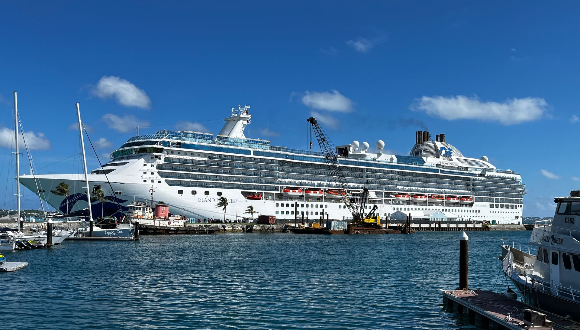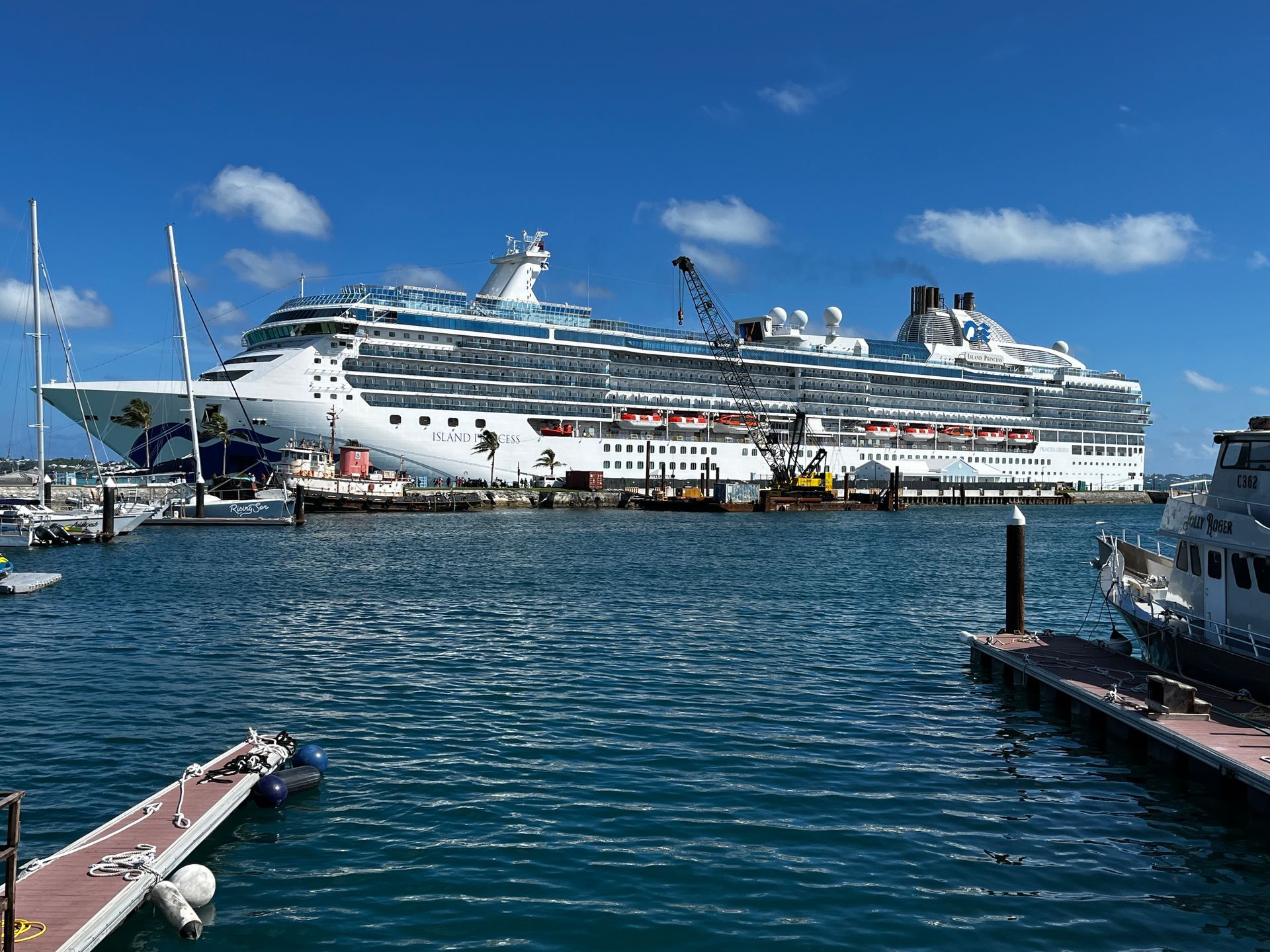 View of the Island Princess docked at King's Wharf from the top of the Royal Naval Dockyards command headquarters.